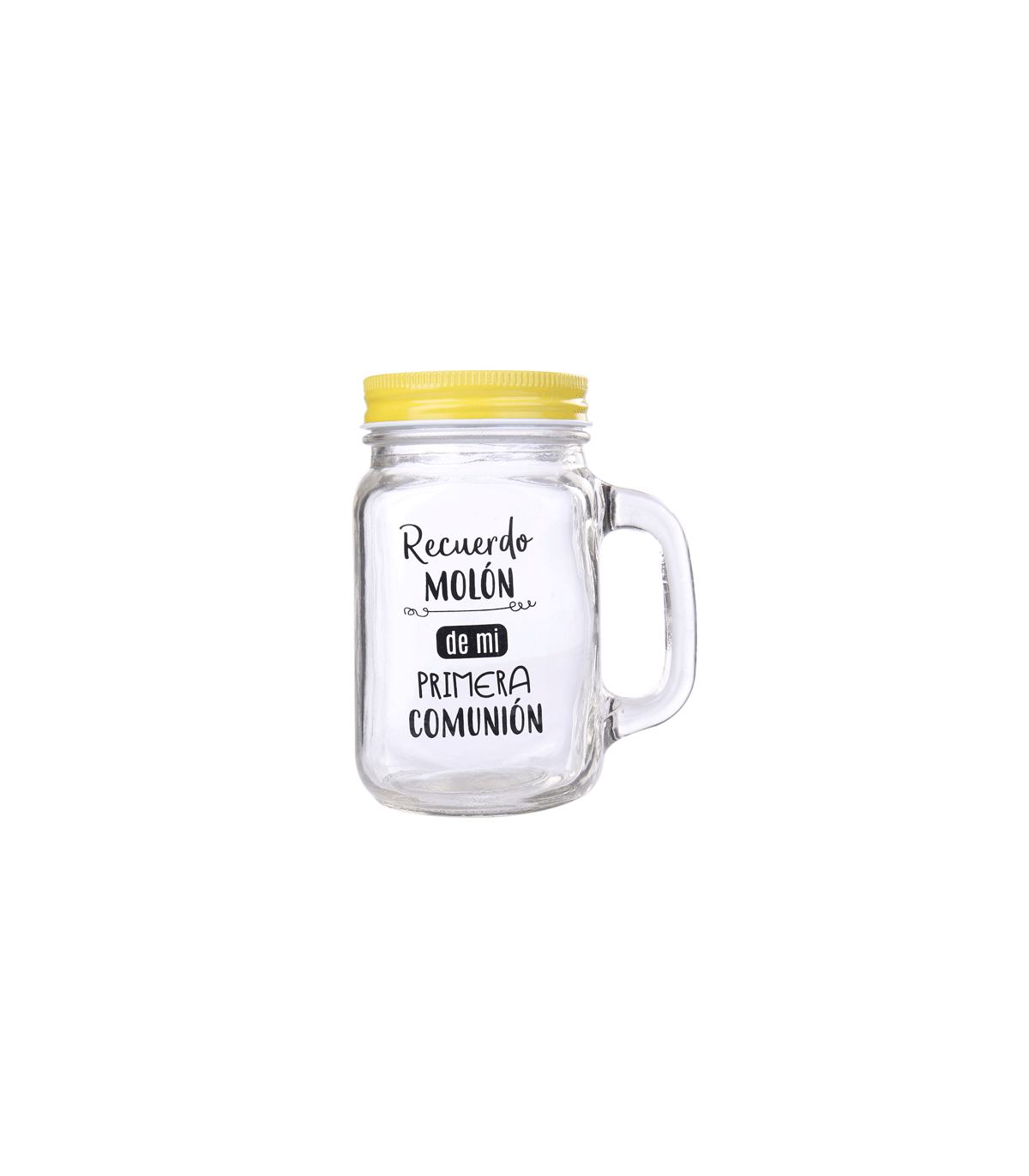 Jarra de cristal con asa y tapa metalíca de color amarillo, a juego con caña de PVC del color de la tapa.